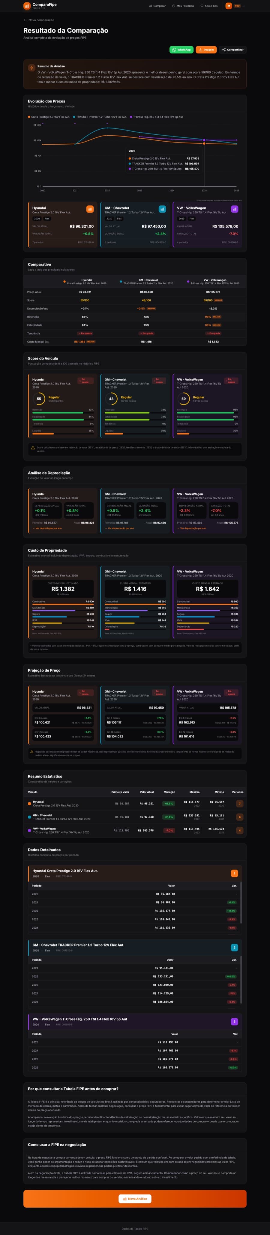O ComparaFipe permite consultar a Tabela FIPE gratuitamente e ir além: você pode comparar o histórico de preços de diferentes veículos, analisar a desvalorização ao longo dos anos e tomar uma decisão de compra mais inteligente com dados oficiais da FIPE.